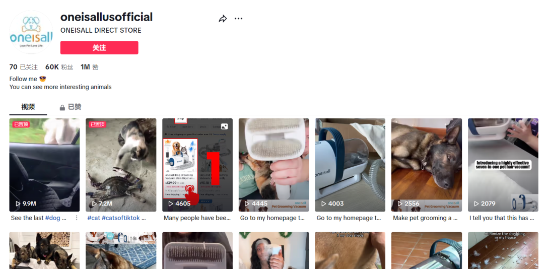 除此之外,ONEISALL的官方账号也在TikTok上积极推广,拥有6万粉丝和100万点赞数,账号内容主要是给宠物使用护理工具的过程及效果。