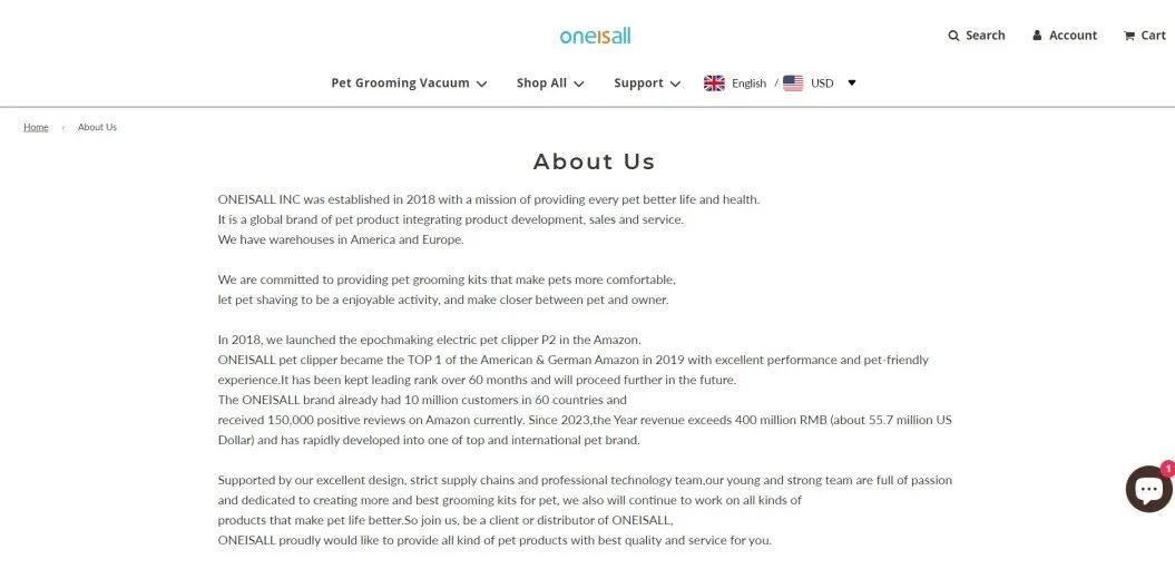 除了在TikTok上的成功,ONEISALL品牌在欧美亚马逊上常年盘踞best seller,2022年销售额超2.2亿。2018年,在亚马逊推出了电动宠物剪刀P2。ONEISALL宠物剪刀以其出色的性能和宠物友好的体验,于2019年成为了美国和德国亚马逊的第一名。已经保持了超过60个月的领先地位,并将在未来继续前进。 ONEISALL品牌已经拥有了60个国家的1000万客户,并目前在亚马逊上获得了15万条积极评价。自2023年以来,年收入已超过4亿元人民币(约合5570万美元),并迅速发展成为国际宠物品牌的一员。