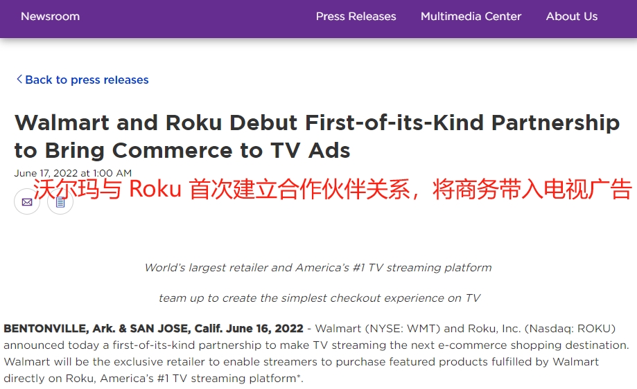 沃尔玛与Roku合作 图源:newsroom