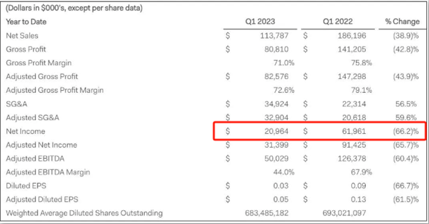 值得一提的是,Olaplex业绩的真正拐点出现在2023年第一季度,该公司2023年第一季度的净销售额为1.14亿美金,对比2022年同期的1.86亿美金下降了38.9%,而当季度的净利润则为2096万美金,同比大跌66.2%。 基于此,当时Olaplex预测2023年全年调整后净利润将下滑28%-44%,为1.76-2.24亿美元。结果显而易见,在2023年后面几个季度,Olaplex依然没能控制住下降趋势,实际利润未达到一季度的初步目标。