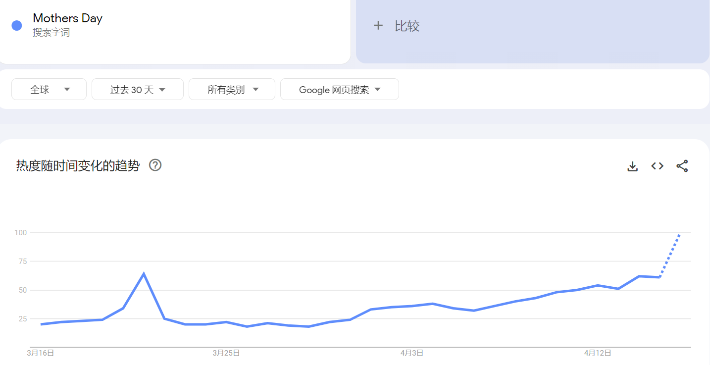 谷歌趋势显示,过去30天内,“Mother's Day”一词全球范围内搜索热度达25—70,从趋势走向来看,4月10日开始搜索热度将在50—100持续飙升。