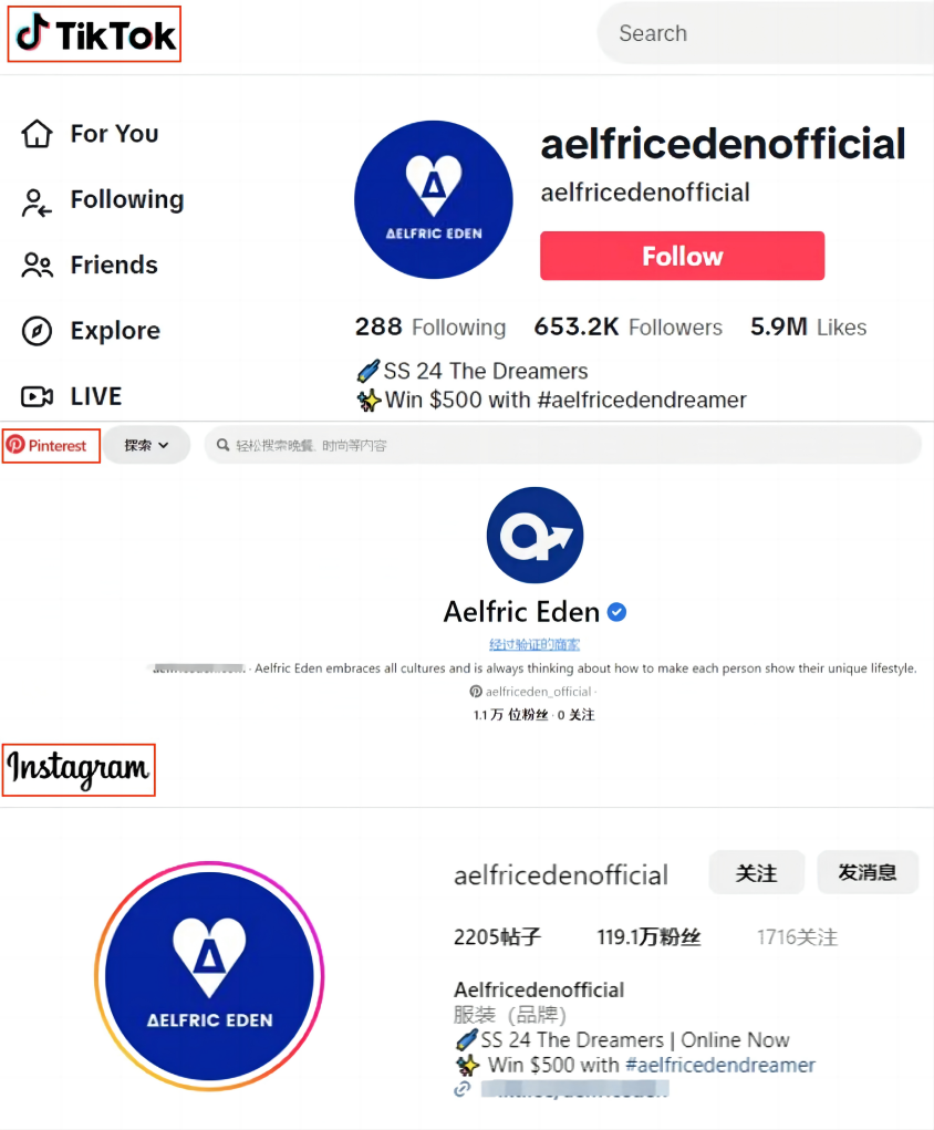 街头时尚的受众基本都是年轻人,而TikTok、ins、Facebook、Pinterest等社交媒体平台又十分受年轻人喜爱,那Aelfric Eden自然不会错过使用它们宣传自身的好机会。