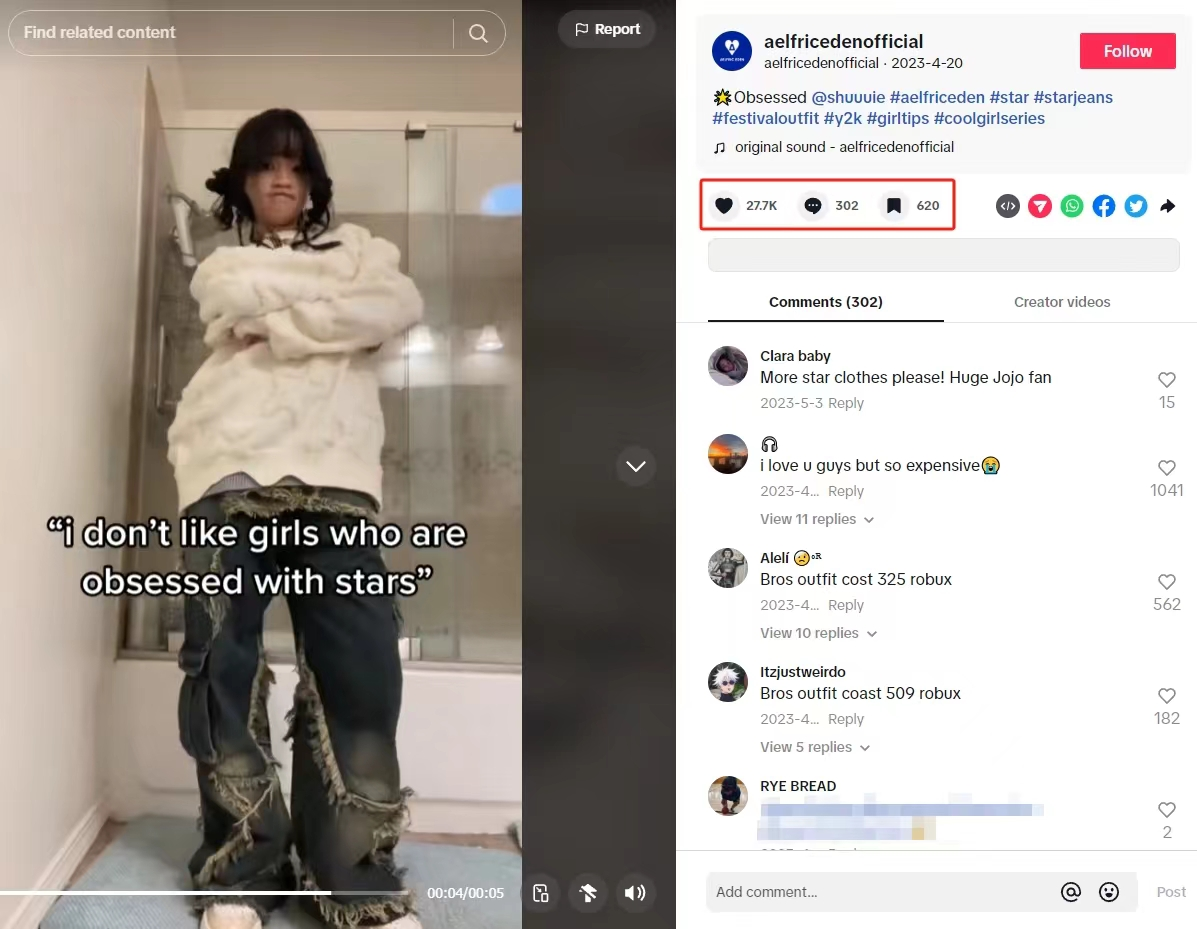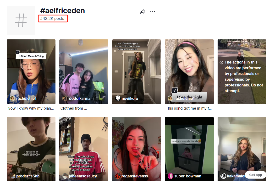 rachelchiu1、dodoikarma、shuuuie……这些TikTok网红达人均与Aelfric Eden合作过,并且合作的视频均获得了不错的效果。例如shuuuie,一位Y2K风格时尚达人,其拍摄的展示Aelfric Eden上身效果的视频,就获得了众多TikTok用户的喜爱。