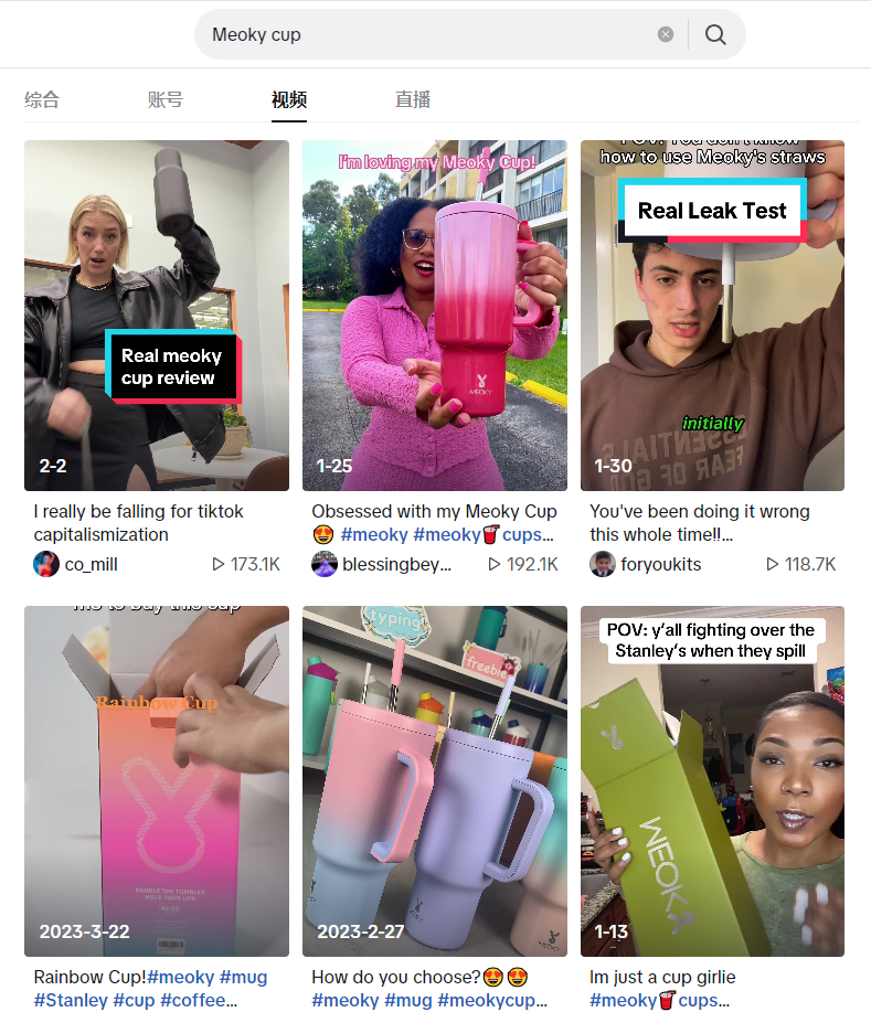 通过搜索商品名称“Meoky Cup”可以看到相关产品的推广视频。因为这款水杯有各种各样的款式,所以许多达人像是介绍时尚单品一样从各个角度对它进行评价,除此之外,也有许多达人从实用性角度出发,测评它的隔热性能、防漏性等等。