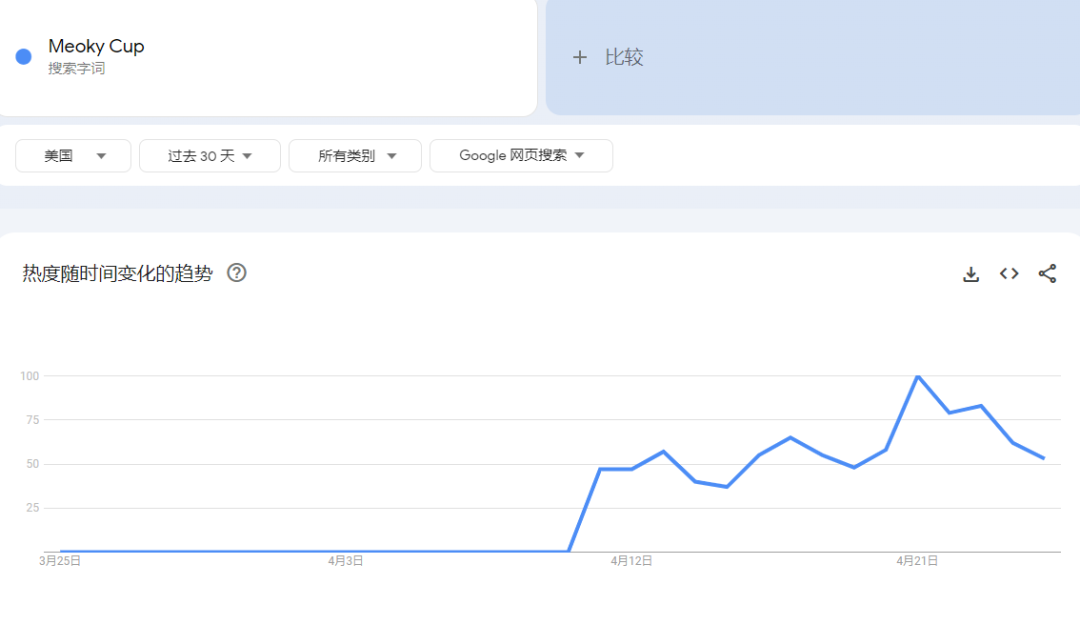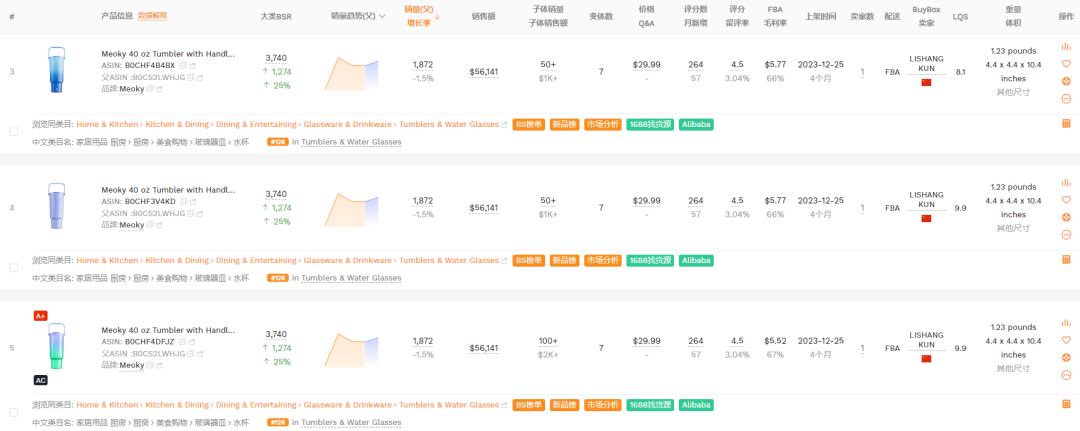 通过Google Trends我们可以了解到一定时期内,产品关键词在搜索引擎上的搜索热度和市场趋势。从下方搜索趋势不难看出美国地区关于“Meoky Cup”的搜索热度自4.11日起,开始逐步上升,说明炎热天气下,人们对水杯的需求也开始有所增大。通过卖家精灵可以看到,关键词“Meoky Cup”的整体销量都在提升,并且这款产品拥有66%的毛利率和4.5的均分,拥有十分良好的市场前景。今天所推荐的隔热玻璃杯已经在TikTok Shop获得数十万订单,包括在亚马逊平台也有上万的销售额,这种随身家用小器具拥有十分广阔的市场前景,不过卖家需要注意的是,这种类型的产品对物流可能会有一定的要求,请结合自身情况谨慎选品。