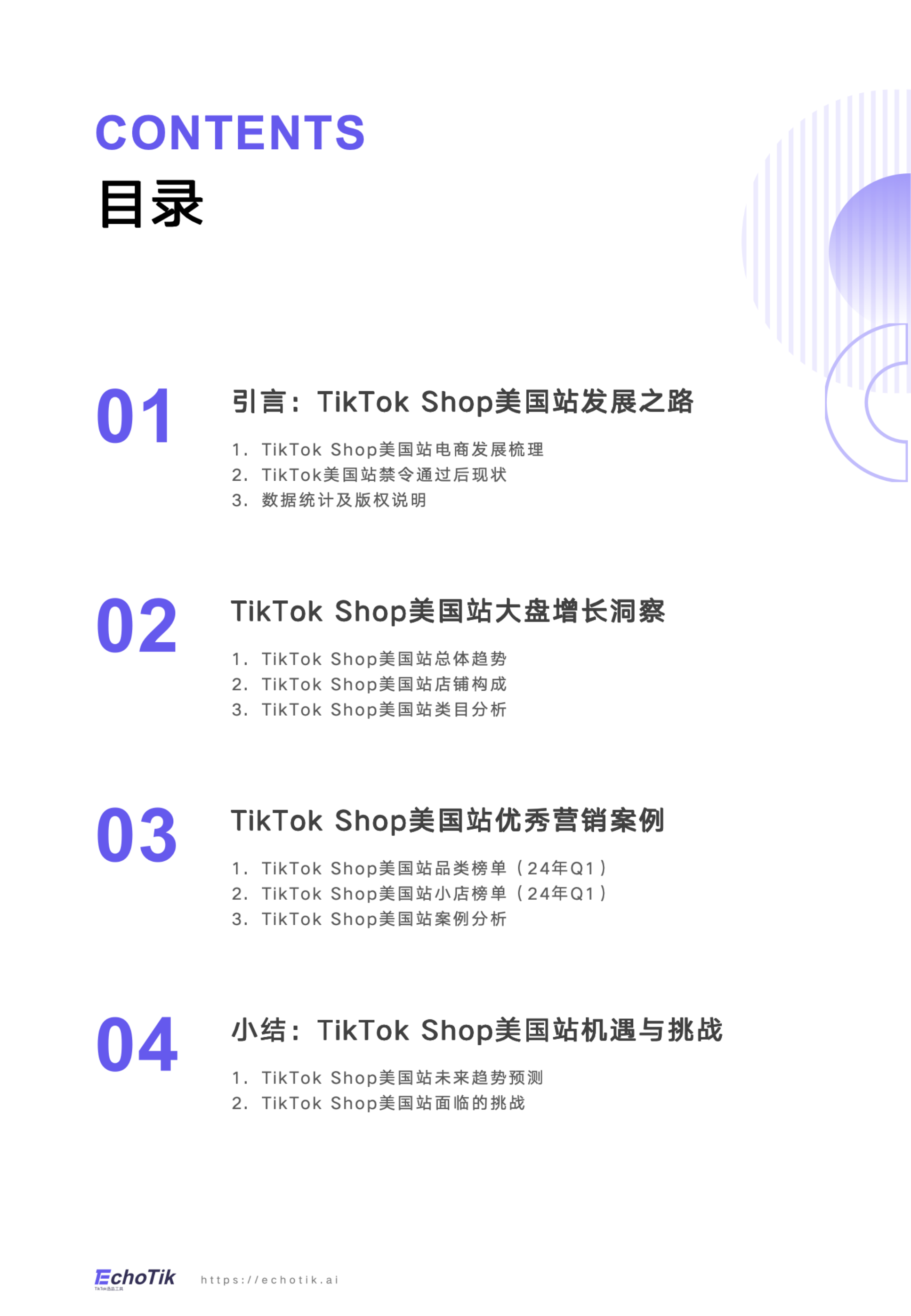 TikTok美国市场的机遇和挑战并行。EchoTik通过对TikTok Shop美国站2023年下半年到2024年第一季度的数据追踪与分析,并撰写了这份《TikTok Shop2024禁令后美国市场洞察》,帮助广大跨境卖家及其从业者分析美国站的机遇点,从而明确运营方向。