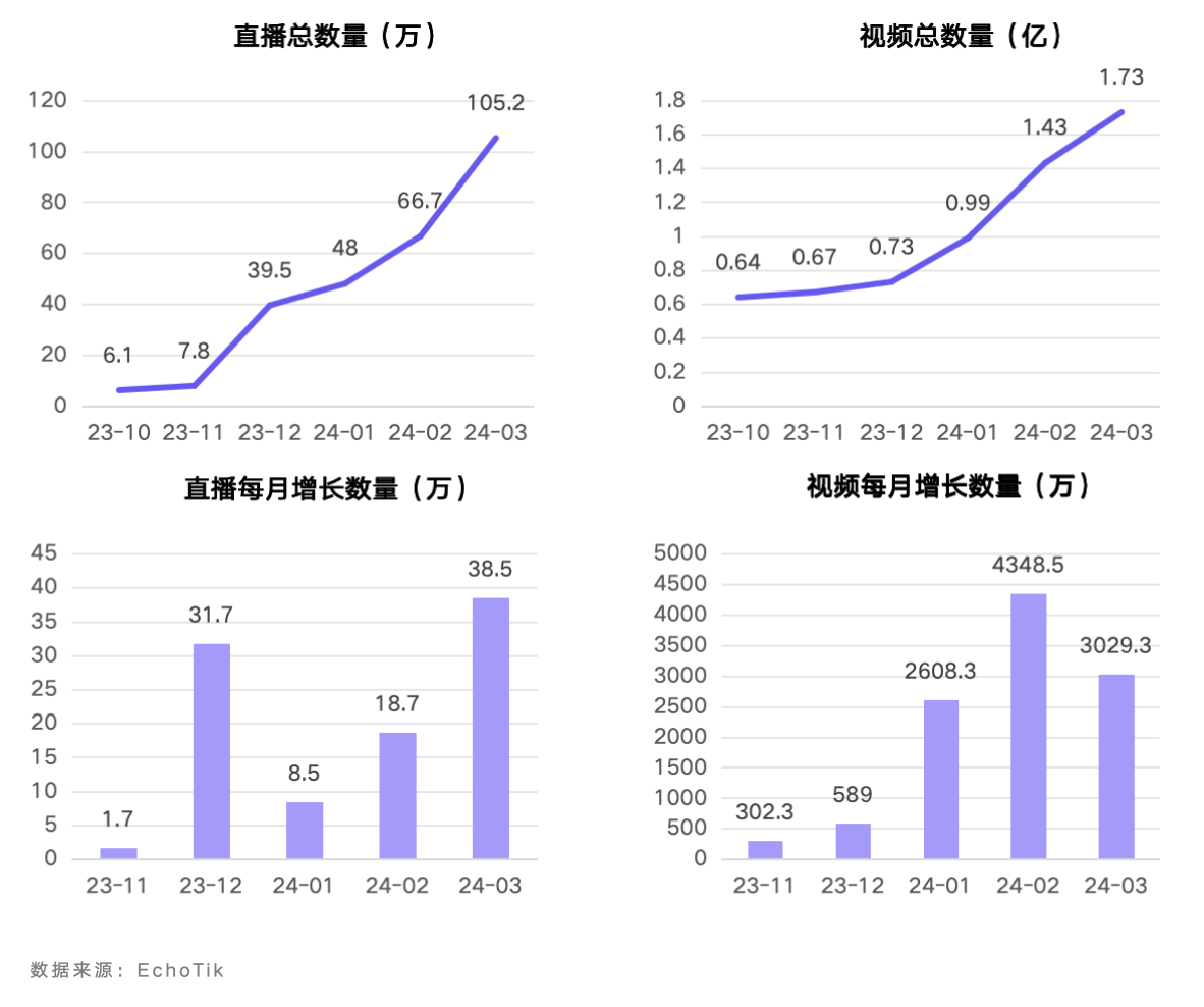 此外,直播带货作为辅助购物方式,正在受到更多本地消费者的认可。在24年3月直播数量增长38.5万次,总计超过105万次,较去年10月增长超过17倍。