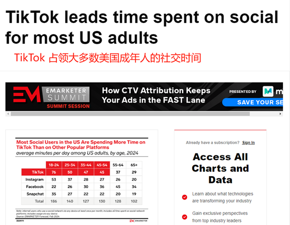 TikTok用户使用时长排名全美第一 图源:Emarketer