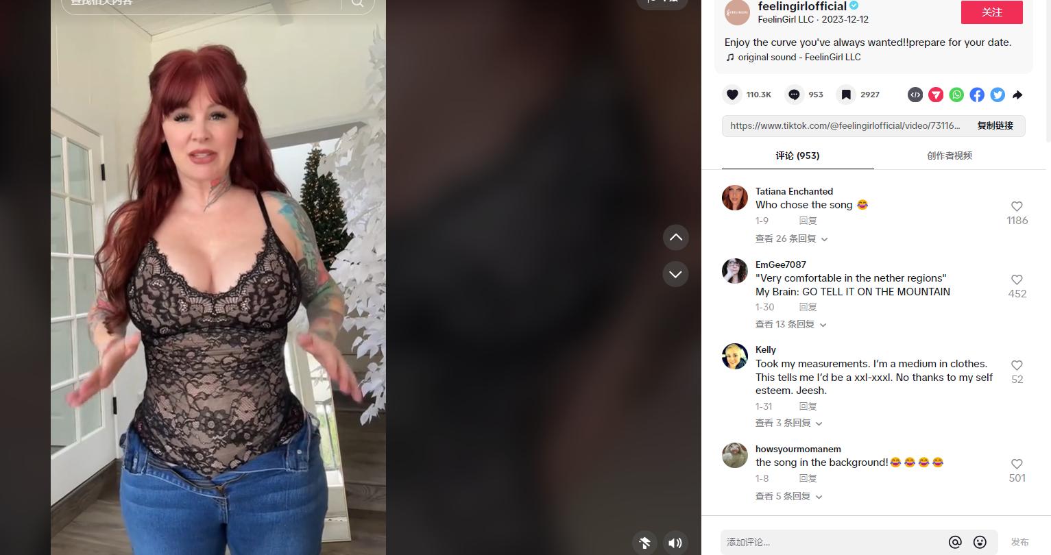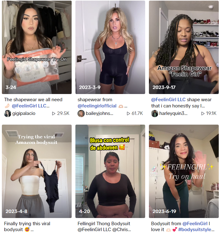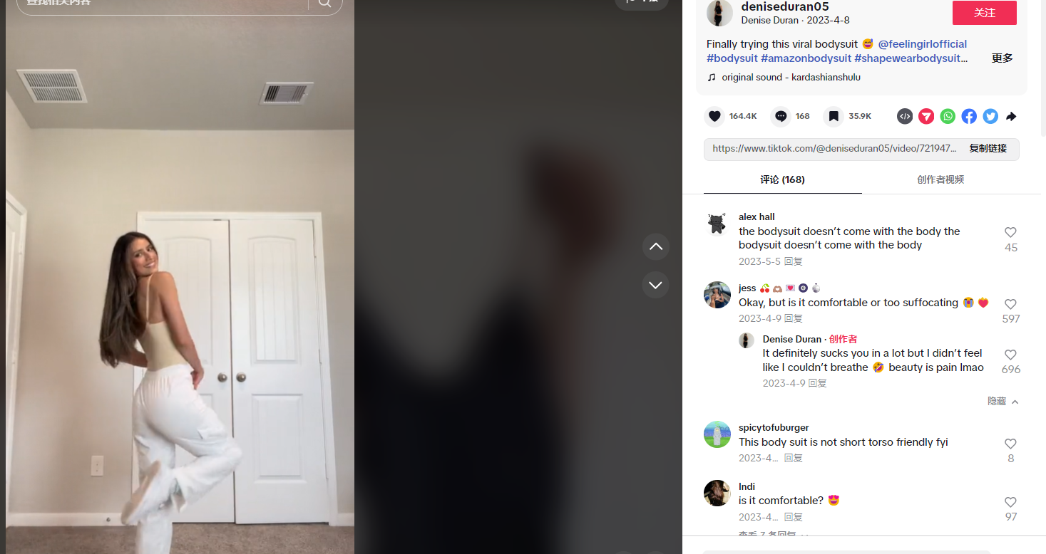去年4月,昵称为“@deniseduran05”的用户在TikTok上发布试穿塑身衣的视频,通过简单更换不同颜色、款式的FeelinGirl塑身衣,并摆造型展示试穿效果,吸引到200万人关注,超过16.4万次点赞。
