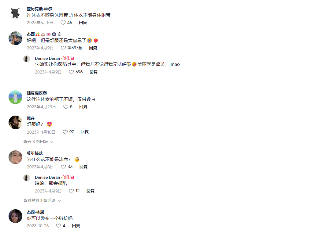 视频的评论区中还有不少用户正在探讨塑身衣的尺码问题,这款穿上一秒能塑型的塑身衣引起大量TikTok用户关注。其实,早在去年春季,该品牌塑身衣在TikTok上受欢迎的程度就很高。