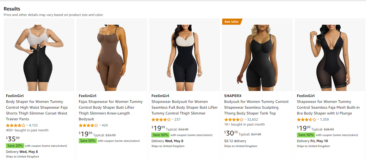 以亚马逊美国站为例,FeelinGirl的塑身衣售价在$19—$36之间,多款塑身衣销量都十分可观。