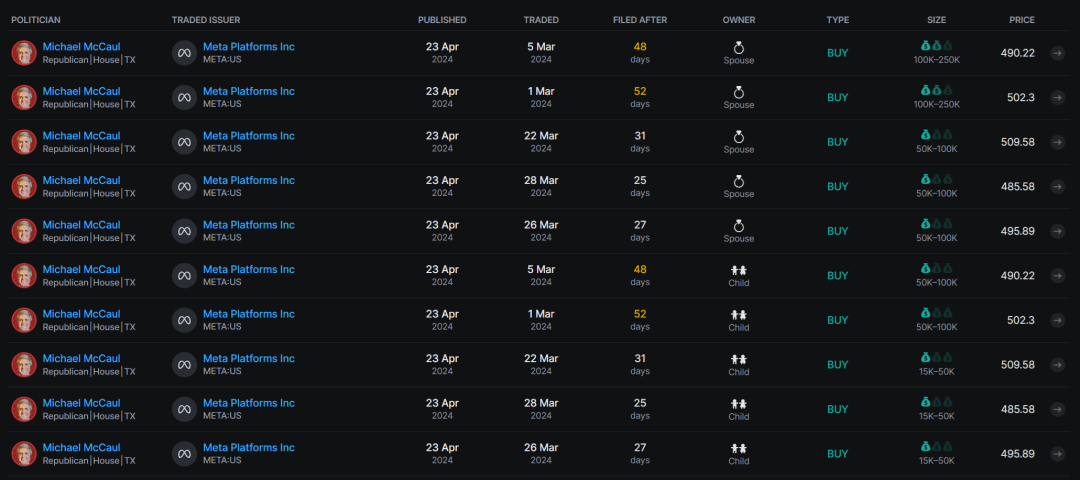4月底,有人在社交媒体爆出,麦考尔在不久前大量买入TikTok竞争对手Meta的股票,金额可能高达115万美元。市场普遍认为,Tiktok若被封禁,Meta旗下的Facebook将成为最大的受益者,股价或将走强。 尽管当时麦考尔有没有直接参与打压TikTok还不好说,但是其实早在去年,他本人确实也起草过封禁TikTok的法案。再加上麦考尔成为最终版TikTok法案的起草人,美国舆论开始怀疑他在借TikTok事件获利。 不过令人意想不到的是,麦考尔的精准潜伏遇到了黑天鹅,在拜登签署法案的第二天,Meta发布了其一季报,其中对于AI的大量投入吓坏了投资者,Meta股价大跌,目前450美元的股价水平显著低于其平均490美元的买入价格,套住了这位议员。 麦考尔的翻车也将议员内幕交易的问题再次至于聚光灯下,人们惊讶的发现,比起巴菲特和基金经理,国会山议员们才是真正卧虎藏龙之地,虽然也有类似这次麦考尔的“翻车”案例,但是论投资收益率和精确伏击能力,传统的金融机构难忘项背。 而麦考尔对此表示毫不知情的表态更是让事件火上浇油,不少美国人纷纷表示他打压TikTok是假,为自己牟利才是真,纷纷炮轰他的行为属于犯罪。 左手打压TikTok,右手埋伏竞争对手 根据相关文件显示,麦考尔的家族信托LLM FAMILY INVESTMENTS LP在3月单月内累计10次买入了Meta的股票,在他的股票交易申报记录中,这10笔买入META的交易显示为其妻子和孩子决策,买入价格在485-509美元之间。