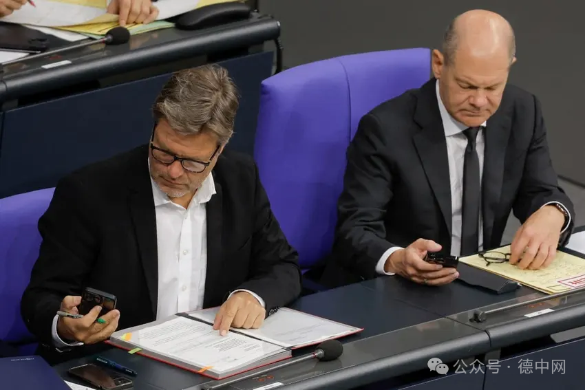 德国经济和气候保护部长罗伯特·哈贝克(左)和德国总理奥拉夫·舒尔茨在联邦议院的一次会议上双双查看手机。(Foto:AFP)