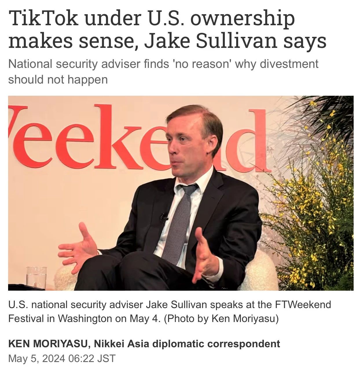 美国国家安全顾问沙利文说,短视频应用TikTok与其母公司字节跳动剥离,并由美资公司收购是完全合理的。据《日经亚洲》报道,沙利文上星期六(5月4日)在华盛顿的一场活动上说,没有理由不在今年实现上述目标。