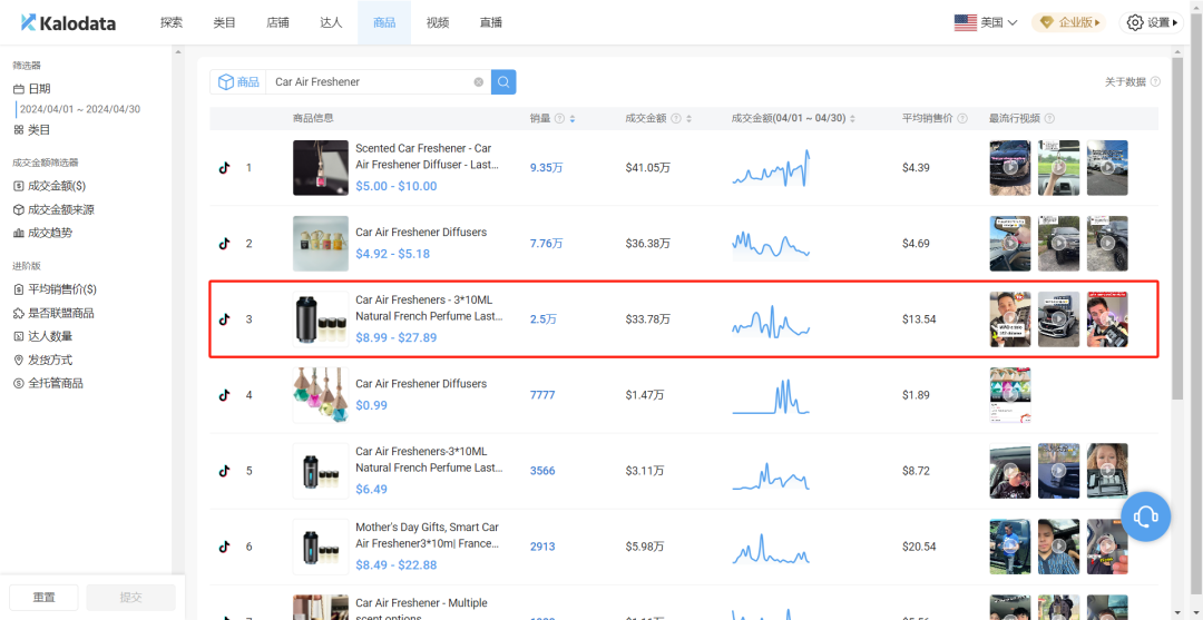 根据Kalodata数据显示,悬挂式车载香薰在美国TikTok市场表现出了强劲的增长势头。其中,4月份有两款悬挂式车载香薰成功进入了前十销量榜单,分别排名第4和第9位。这两款产品在外观上基本一致,除了贴纸不同外,其余几乎一模一样,而且平均售价都在4.5美元左右。