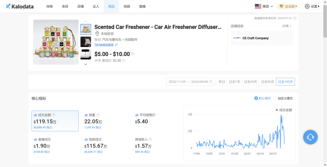 以4月销量排名最高的悬挂式车载香薰为例,其所属店铺为CE Craft Company。据Kalodata数据显示,这款产品于2023年7月底上架TikTok美国小店,早在全闭环内测阶段就开始布局,为后续销量爆发奠定了基础。过去半年中,该商品总销量超过22万件,总销售额约为119.15万美元。 近期,该产品销售量进一步攀升,仅在2024年4月29日,销量就高达7936件,销售额达到约3.97万美元,成为近半年来销售额最高的一天。这表明该产品持续受到关注,用户需求旺盛。