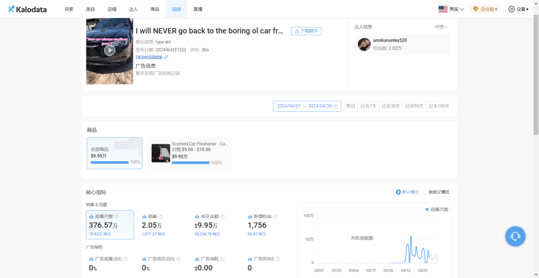 综上所述,从悬挂式车载香薰在美国TikTok市场的强劲增长势头可以看出,消费者对车内环境品质的日益关注。这些悬挂式产品在外观上更加时尚,价格也更具吸引力,进一步刺激了消费者的购买欲望。 通过CE Craft Company在TikTok上的成功案例,我们可以看到有效的营销策略对产品销售的重要性。借助于自营账号和联盟达人的合作,CE Craft成功地在TikTok推广了悬挂式车载香薰,进一步提升了产品的曝光度和销量。此外,通过价格优势和针对性的广告投放,他们成功地吸引了大量消费者,进而实现了销售额的持续增长。 因此,随着消费者对驾驶体验和车内环境品质的重视程度不断提升,车载香薰市场将继续迎来更多的发展机遇。 [ad]文章来源:Kalodata研究院