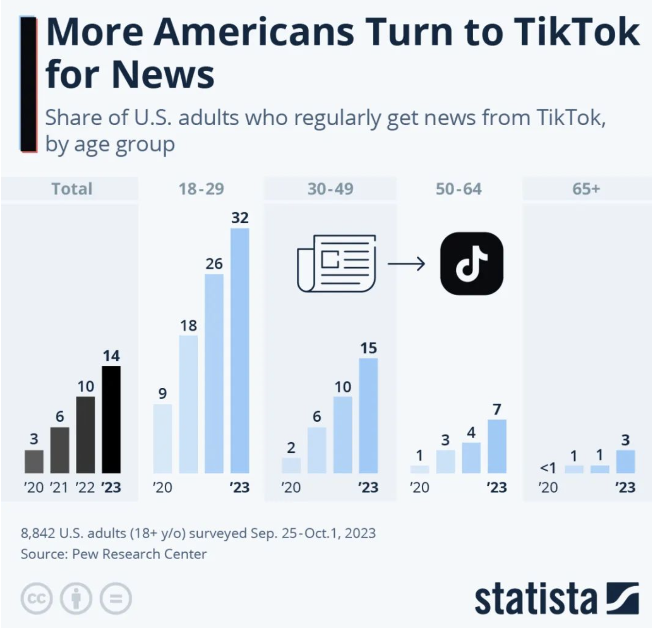 有近三分之一(32%)的18-29岁年轻人表示,他们经常使用TikTok获取新闻。