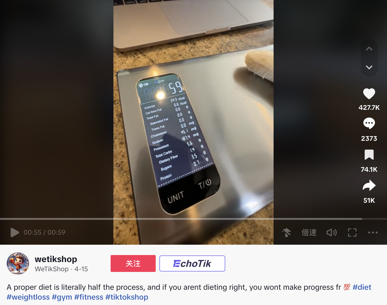 从目前出单情况上来看,目前带货效果好的视频主要围绕使用教学演示来展开。博主@wetikshop 是一个专门推荐TikTok Shop值得购买的好物的账号,在为电子秤带货的视频中,他演示了用电子秤计量一根去皮香蕉和一袋小胡萝卜的过程:只需在APP输入食物种类,或者扫描食物包装上的条形码,结合电子称的称量功能,面板上即刻显示出了食物的热量和详细的营养成分,包括:碳水化合物、脂肪、蛋白质、含糖量等。在评论下,许多人表示这款食物秤非常新奇且实用。 最终,这1分钟的视频成功转化1.2万销量,近35万美元销售额。按照28%的佣金率,达人靠这条视频拿到了9.8万美元的返佣。