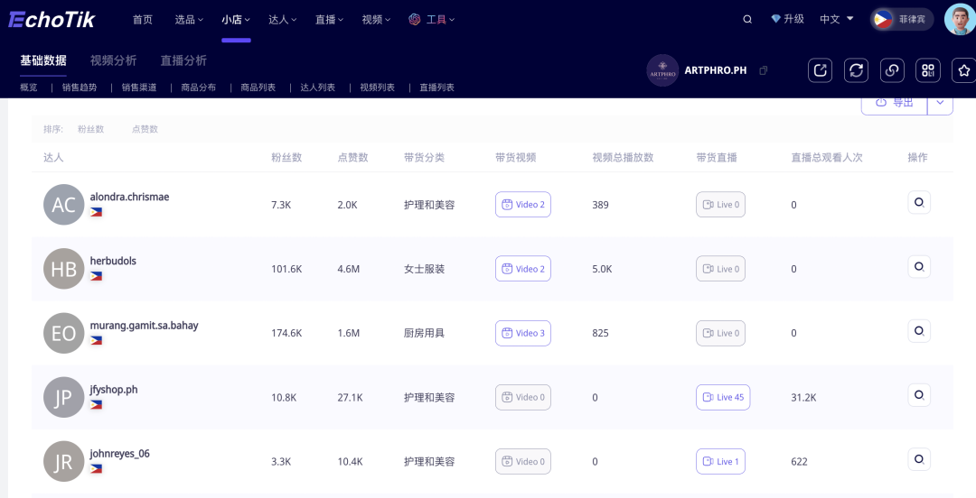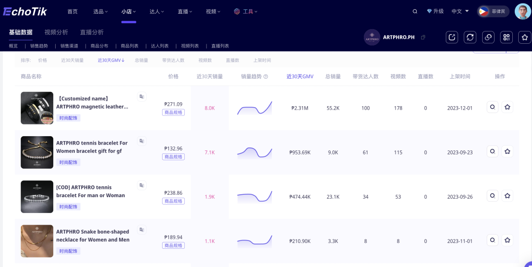 ARTPHRO在东南亚首选了菲律宾市场,起初充分调研了菲律宾当地文化特色,并且利用了TikTok平台的内容社交优势,根据用户的需求迭代产品,快速获得了新用户的喜爱。 据Echotik数据显示,过去1个月,ARTPHRO 菲律宾小店的GMV约为480万比索(折合8.38万美金),销量超过2.2万件。