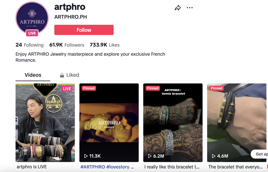 从流量端来看,TikTok东南亚市场是年轻人的聚集地,拥有经济发展红利、人口红利,互联网使用时长在持续增长,是新品牌实现竞争突围的优选。 ARTPHRO品牌在2024年加大了在东南亚市场TikTok Shop上资源的投入。目前ARTPHRO在TikTok Shop的官方账号,布局了品牌直播和短视频带货。 据Echotik数据显示,ARTPHRO的官方账号在TikTok上,拥有近6.2万粉丝和73.4万点赞数,账号内容主要是以产品细节展示、佩戴效果展示为主,很好的建立了品牌形象。