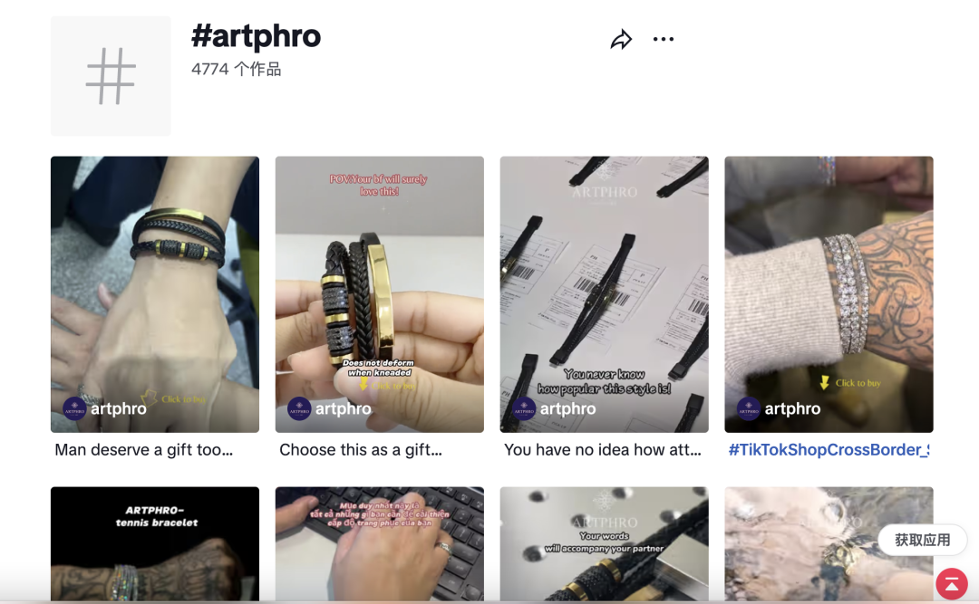 品牌话题标签#artphro在TikTok上已经积累了4770多个作品,不断积累品牌的声势。