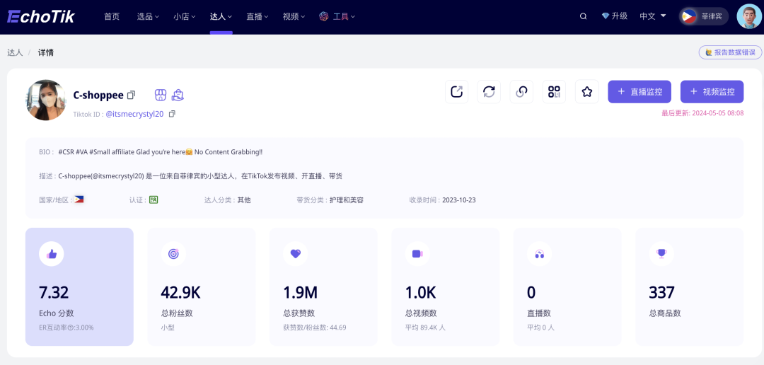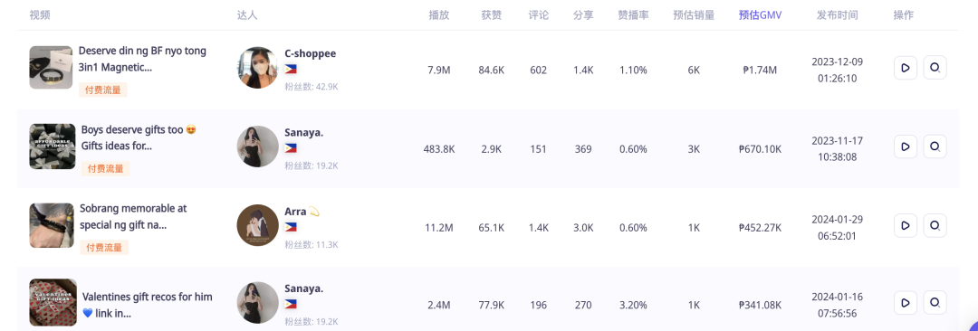 带货GMV最多的视频来自@itsmecrystyl20,菲律宾的小型达人。