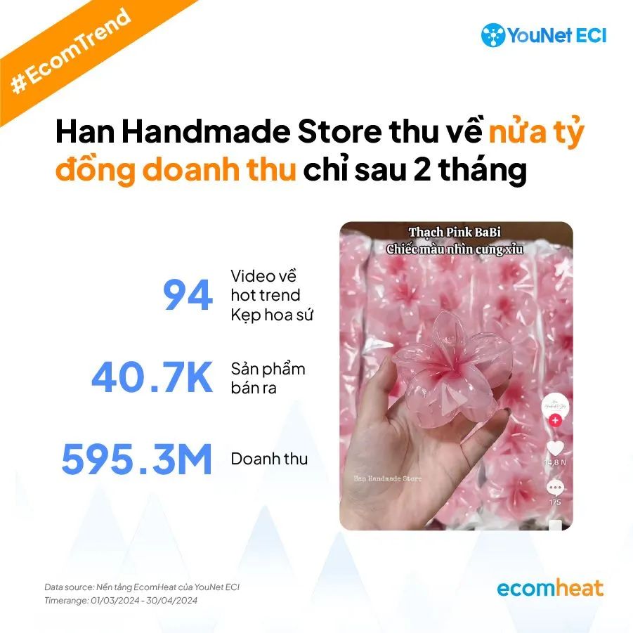 数据显示,TikTok Shop上销售最好的瓷花夹商店是Han Handmade Store,开业仅2个月就售出超过40000件产品。YouNet ECI市场分析部总监Nguyen Phuong Lam分析指出,该店铺成功有3个因素:一是顺应流行趋势,粉丝基础庞大;市场灵敏度高;视频内容输出质量高。