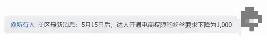 但是,官方出台一个政策,封杀掉一批人后,通常会再开一个口子。那么,这次开的口子是什么呢?达人开通电商前的粉丝要求下降为 1000 个。