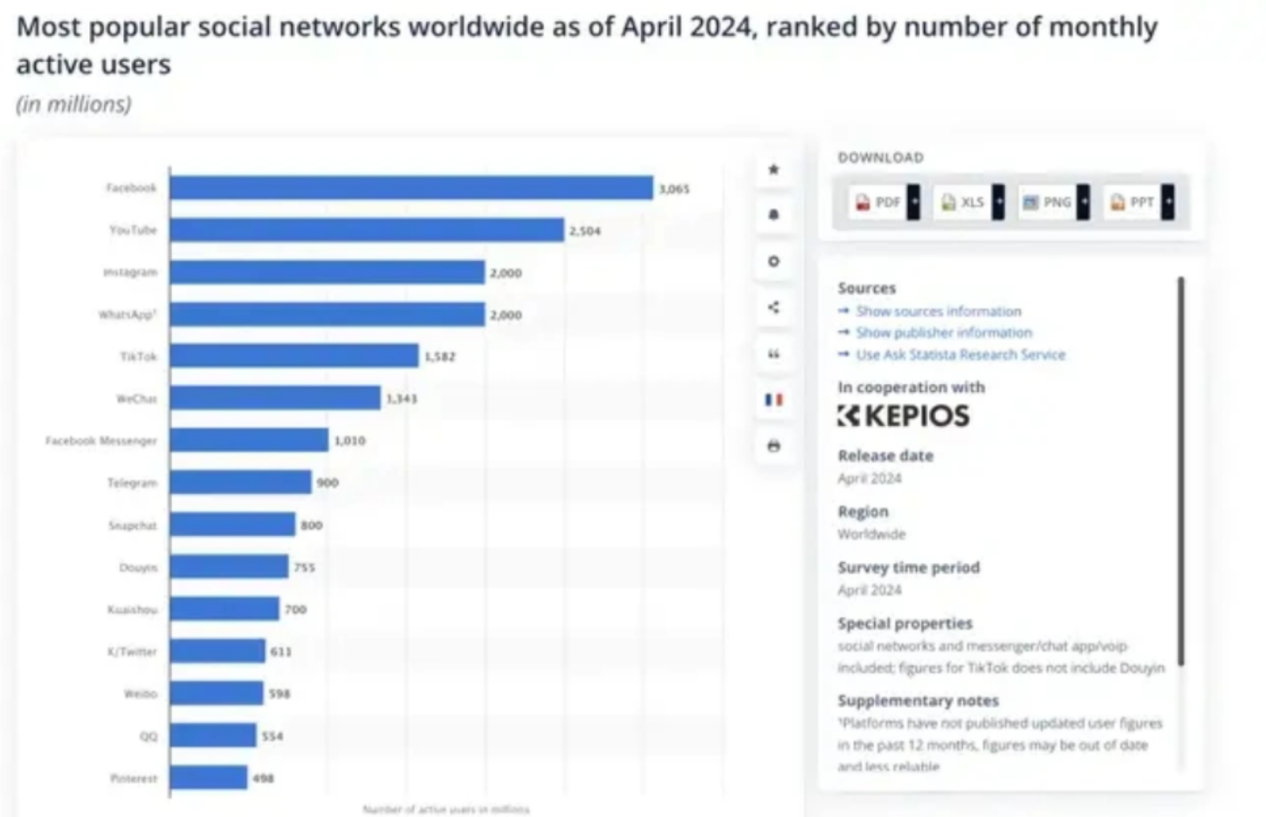 5月14日消息,根据Statista发布的最新报告,截至2024年4月,TikTok(抖音国际版)的全球下载量已超过49.2亿次,月度活跃用户数突破15.82亿,成为全球第五大最受欢迎的社交应用。