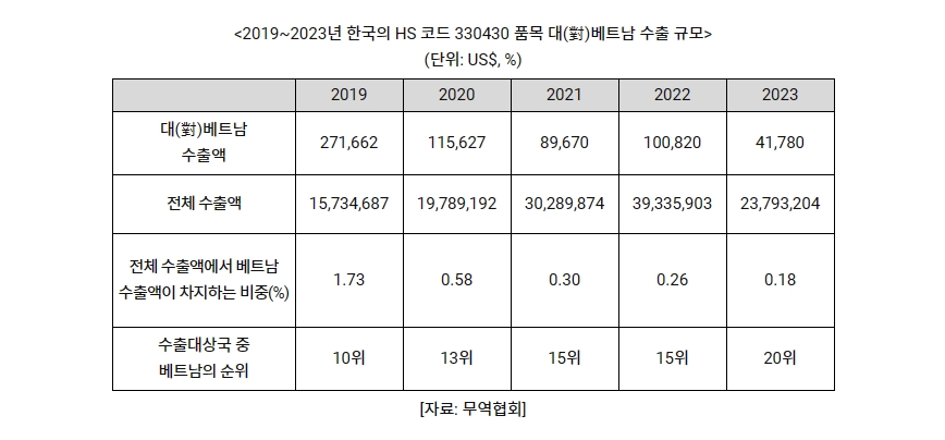 반면, 젤네일 스티커가 포함되는 HS 코드 391990 품목의 경우 베트남은 여전히 중요한 시장인 것으로 나타난다. GTA에 따르면 베트남에서 한국이 해당 품목 수입 대상국 1위를 기록하다가 2022년 이후에는 2위를 유지하고 있으며, 무역협회 통계에서는 최근 5개년 간 베트남은 해당 품목 관련 한국의 2위 수출대상국이었다. 비록 전체 수출액에서 베트남으로 수출되는 한국의 네일 케어 제품의 비중이 줄어들고 있는 것으로 나타나지만, 모수인 전체 수출액의 변동에 따른 부수적인 비중 축소로 보이며, 향후 현지 시장의 잠재력을 고려한다면 여전히 수출 가능성을 타진할 수 있는 시장으로 판단된다.