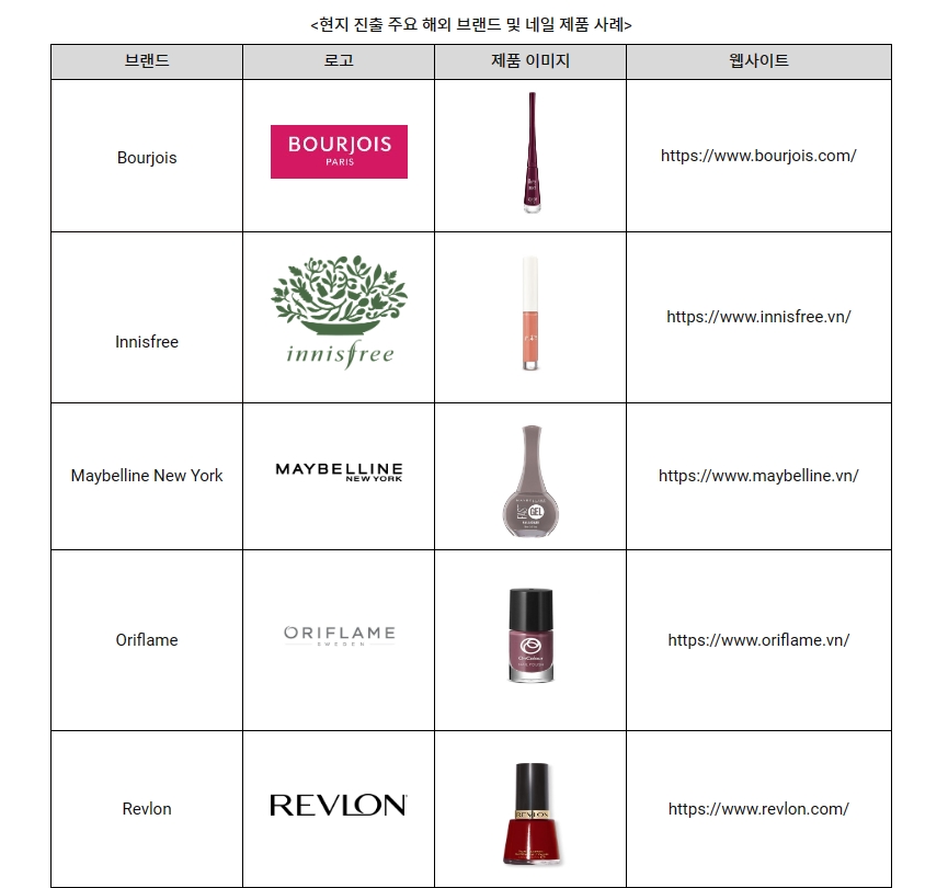 베트남 네일케어 시장에는 한국 브랜드인 더페이스샵(The Face Shop)과 이니스프리(Innisfree) 외에도 레브론(Revlon, 미국), 메이블린뉴욕(Maybelline New York, 미국), 부르조아(Bourjois, 프랑스), 오리플레임(Oriflame, 스웨덴) 등 해외 브랜드가 진출해 있다.