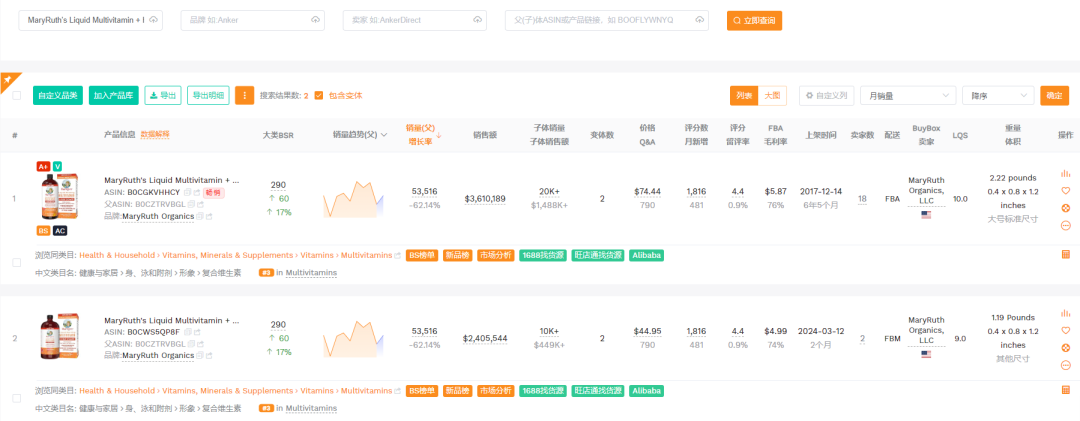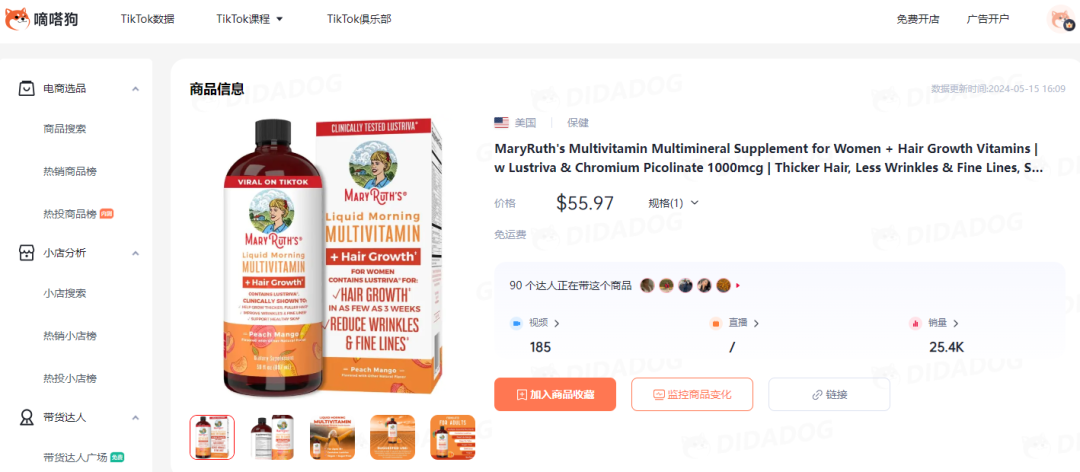 嘀嗒狗数据检测到最近有一款专注头发健康的液体维生素大受欢迎,销售额正在逐步升高之中。