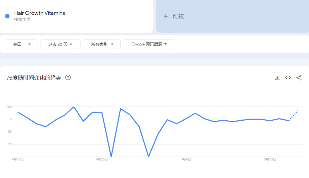通过Google Trends我们可以了解到一定时期内,产品关键词在搜索引擎上的搜索热度和市场趋势。从下方搜索趋势不难看出美国地区关于“Hair Growth Vitamins”的搜索需求总体来说是比较旺盛的,过去三十天里只有两天没有足够的数据支撑,其余时间整体搜索需求都十分巨大。