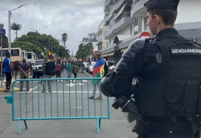 A gendarme on guard in Nouméa after five days of unrest over a controversial electoral bill. Image: Caledonia TV