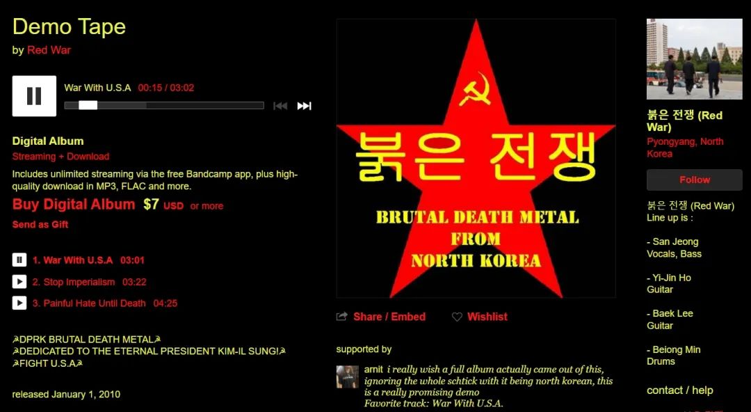 在体制之外,朝鲜的摇滚传说也在江湖上不断流传。 这支名为“红色战争”(RED WAR)的朝鲜残酷死亡重金属乐队就是最知名的存在,无论是专辑概念还是歌曲名称《向美国开战》、《停止帝国主义》、《痛恨至死》都有着浓烈的朝鲜气血味儿。 在重金属核嗓的演唱下,乐队仿佛带听众们进入了朝鲜音乐的B面。