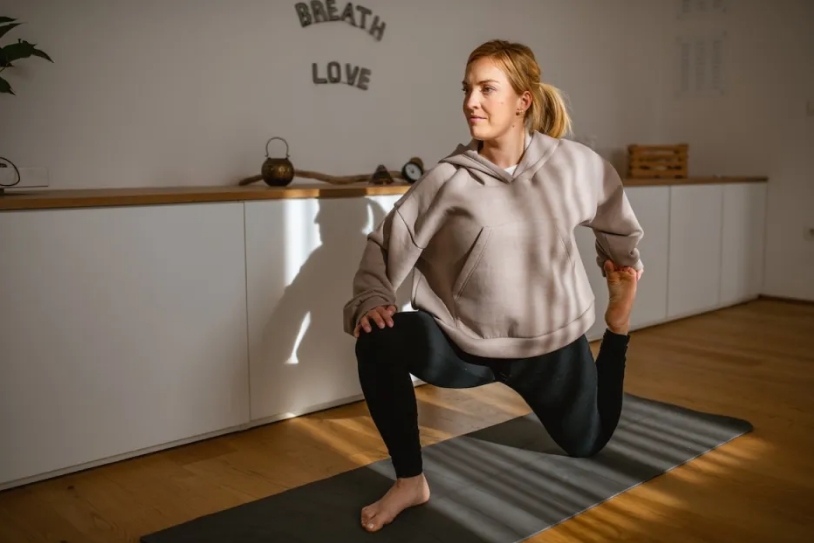 - Grab the foot of your back leg up and lift it up to your butt (like you’re doing a quad stretch).
