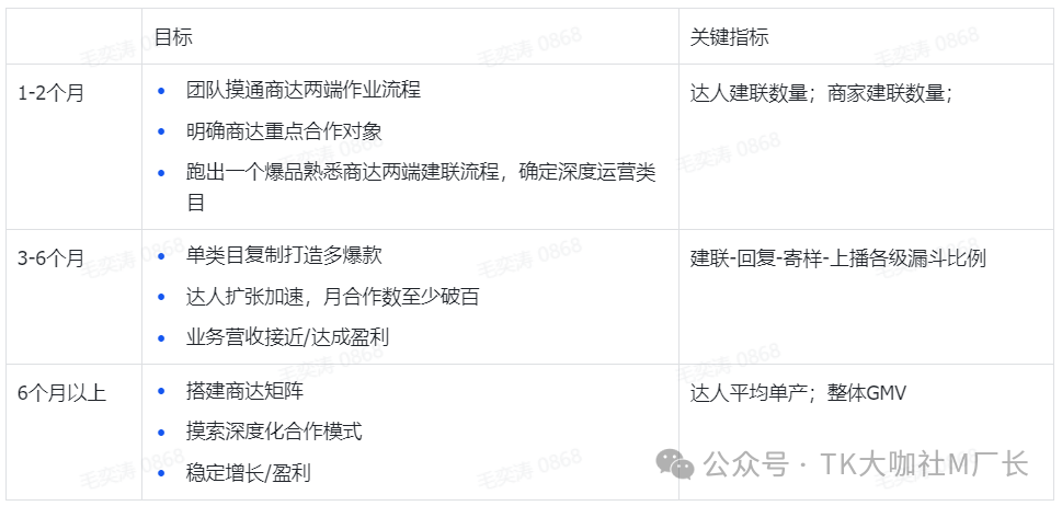 TAP的目标是在第一到二个月,新的TAP机构需要摸通整体两端的作业流程,同时达到一定数量的达人建联和商家的建联。