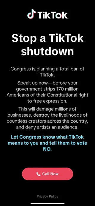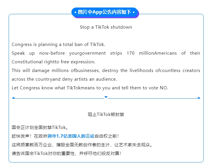 TikTok继续呼吁用户游说当地议员反对出售法案,但既然法案已经通过,这种办法现在看起来就像是“白忙一场”。 不知道大家是否记得三月份。TikTok就搞了个“大动作”,把好多创作者送到华盛顿,希望他们能亲自发声反对那个法案。 TikTok还在应用里发了警告,提醒美国用户联系他们的代表,希望合力把出售法案给否了。不过现在看来,这一切努力都白费了。