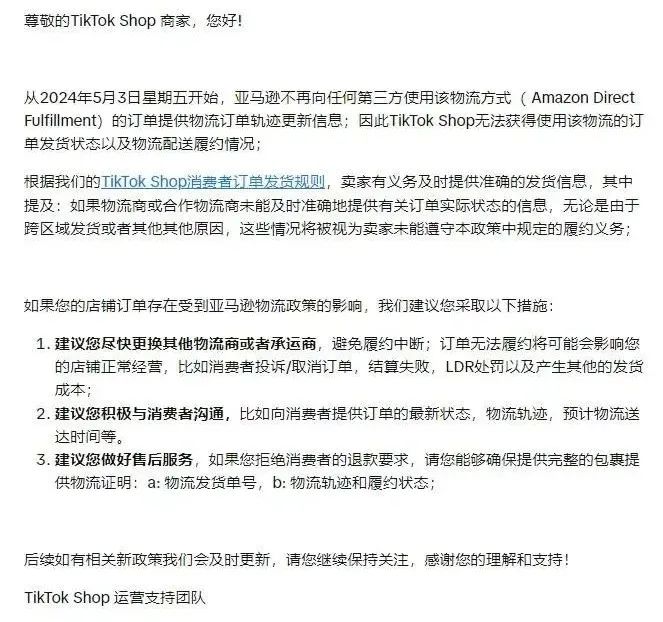 再然后,美区TikTok Shop为啥会加快对FBT的支持?除开之前的理由外,TikTok Shop,FBT,是必定要加入的。还有个迫在眉睫的问题,它和亚马在物流上的合作,没谈下来。已经发了邮件让卖家换物流商了。