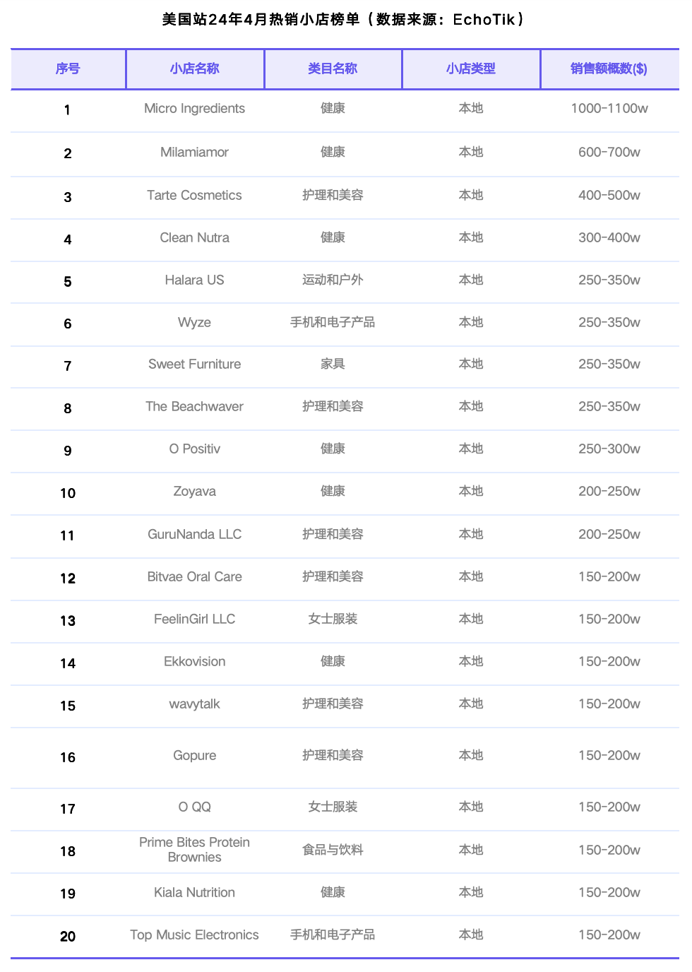 对比上个月,15家小店均为3月上榜Top 20的小店,美国站的头部小店的局势较为稳定。不过,也有一些新的小店上榜。5家新上榜小店分别为:O Positiv(第10名)、FeelinGirl LLC(第13名)、wavytalk(第15名)、Gopure(第16名)和Kiala Nutrition(第19名)。