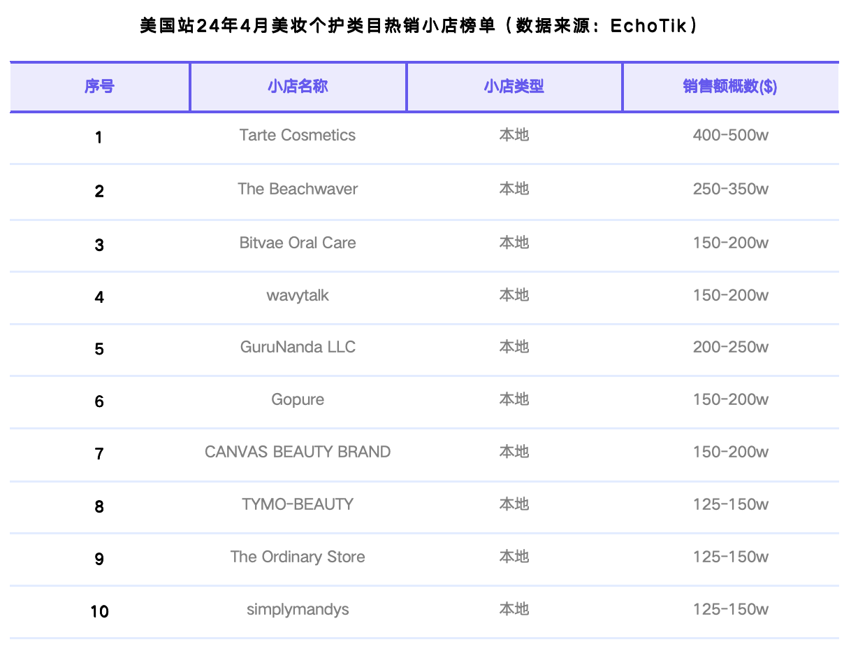 美妆个护类目Top 10热销小店均为本地店铺,Tarte Cosmetics依然保持着第一名的位置,销售额是第二名:The Beachwaver的近2倍,但销售额对比3月有所下降。对比3月,4家新上榜小店分别为:Gopure(第6名)、TYMO-BEAUTY(第8名)、The Ordinary Store(第9名)和simplymandys(第10名)。