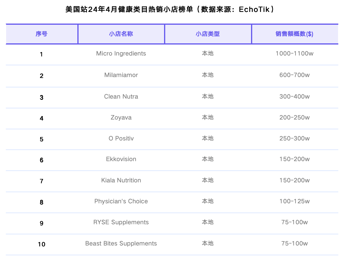 健康类目是本月增长的黑马,主要是由于该类目下的热销小店的销售额暴涨。Micro Ingredients 连续两个月位列类目Top 1,销售额环比上涨134%;Milamiator较上月排名上涨2位,销售额环比上涨近100%;O Positiv排名上升2位,销售额环比上涨68%。
