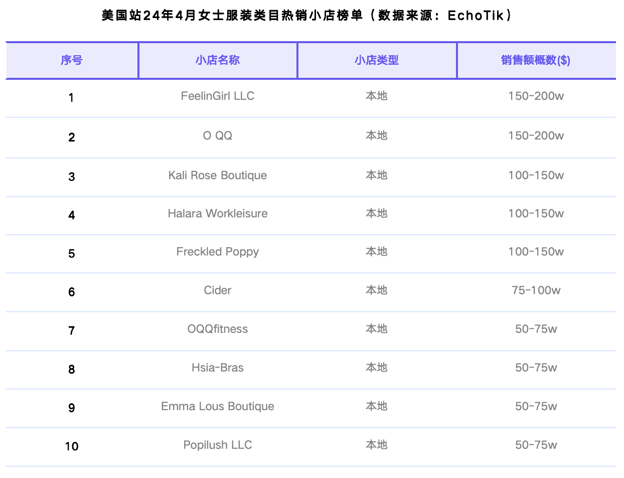 女士服装类目较上月整体GMV和排名有所下降。4月小店Top 1位FeelinGirl LLC,较上月排名上升了4位,销售额在150-200万美元;3月小店第一名O QQ位列第2名,两家小店的GMV差额在10万美元左右;Halara Workleisure小店位列第4名,区别于主要产品线的运动装,该小店主要销售工作休闲通勤装。新上榜小店有:Emma Lous Boutique(第9名)和Popilush LLC(第10名)。
