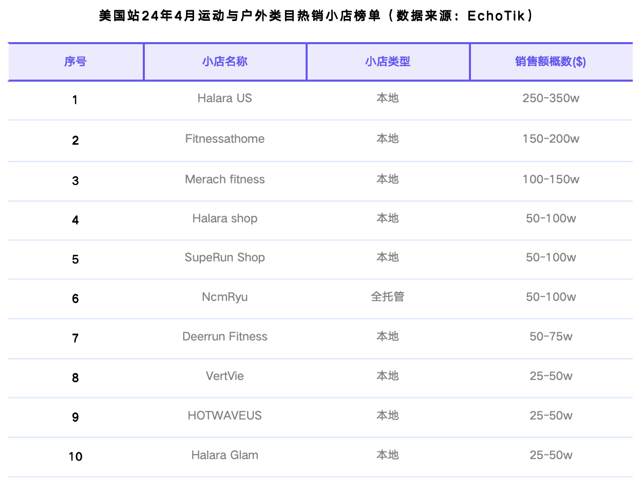 运动与户外类目较上月整体GMV和排名均处于增长状态。在前10名小店中,除第6名:NcmRyu为全托管小店以外,其余均为本地小店。其中,中国运动女装出海品牌 Halara占2家,分别为第1名Halara US和第4名Halara shop。算上女士服装的小店,Halara共计有3家小店上榜。