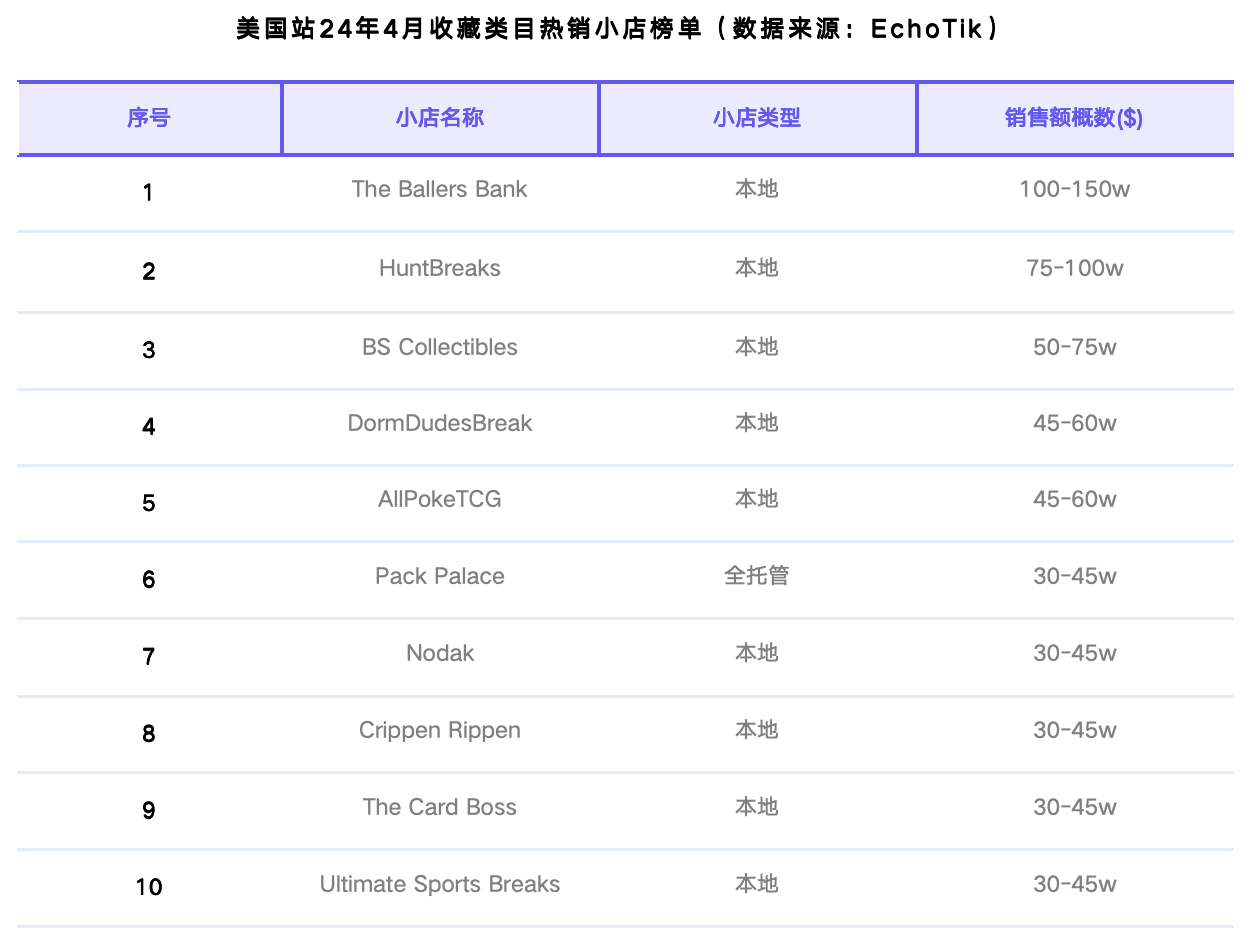 收藏类目较上个月销售额和排名均有所下降,主要是由于该消费群体的需求得到暂时的饱和与满足。类目下的爆品为球星卡、收藏卡等。相较于上个月,共有3家新上榜小店:Crippen Prippen、The Card Boss和Ultimate Sports Breaks。