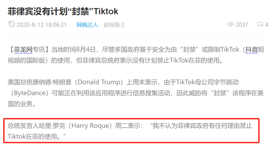 反观2020年,菲律宾政府高官还公开表示支持TikTok,这一态度的急剧转变令人深思。 经过了4天的舆论发酵, 5月28日当天,菲律宾时报发布消息,称菲律宾信息和通信部 (DICT) 表示并不愿意支持在菲律宾全面禁止社交媒体应用程序TikTok的提议。 DICT 副部长在简报会上表示,DICT更希望对所有社交媒体应用程序和网站进行监控和监管,而不是实施全面禁止。东南亚增长神话