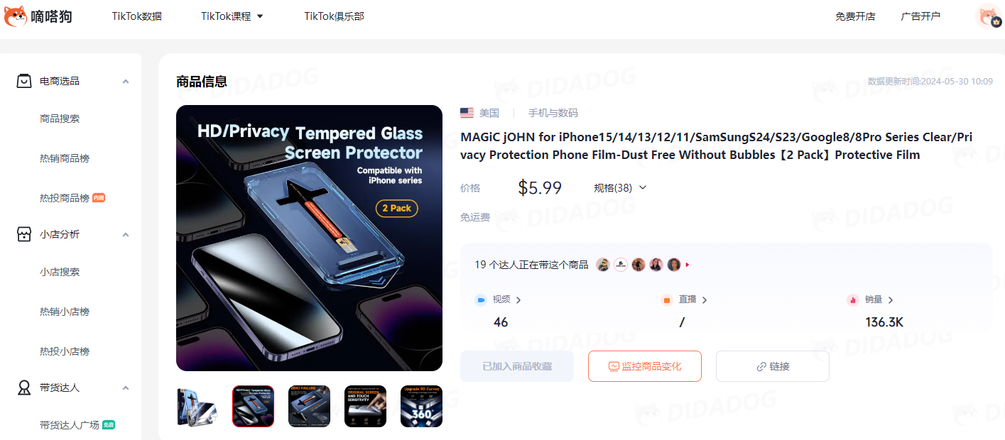 TikTok美国站“手机钢化膜”日出6500单,手机配件市场广阔 | 嘀嗒狗