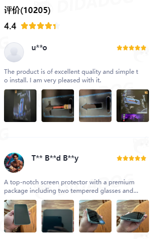根据嘀嗒狗数据显示,这款产品在3月17日上架TikTok Shop,近30天里,这款产品的日均出货量都在1500单以上,5月26日单日出货量更是高达6500单。仅仅不到三个月,销量超13万单。为专营手机钢化膜小店MagicJohn.USA带来了超100万美金的销售额。 过去30天里有19位达人推广该产品,其中绝大多数达人为腰部达人,平均粉丝量为6.4万。其中粉丝量最高的达人是@yvaraneb,在TikTok拥有超过330万的粉丝,累计获赞超3000万,属于家居用品领域的头部达人。(更多数据可进入嘀嗒狗营销达人广场查看) 通过嘀嗒狗数据可以看到已购用户的评论。购买过的许多人都附上了自己的安装前后的对比图,并纷纷表示这款保护膜有着超高的透度以及非常简易的安装。