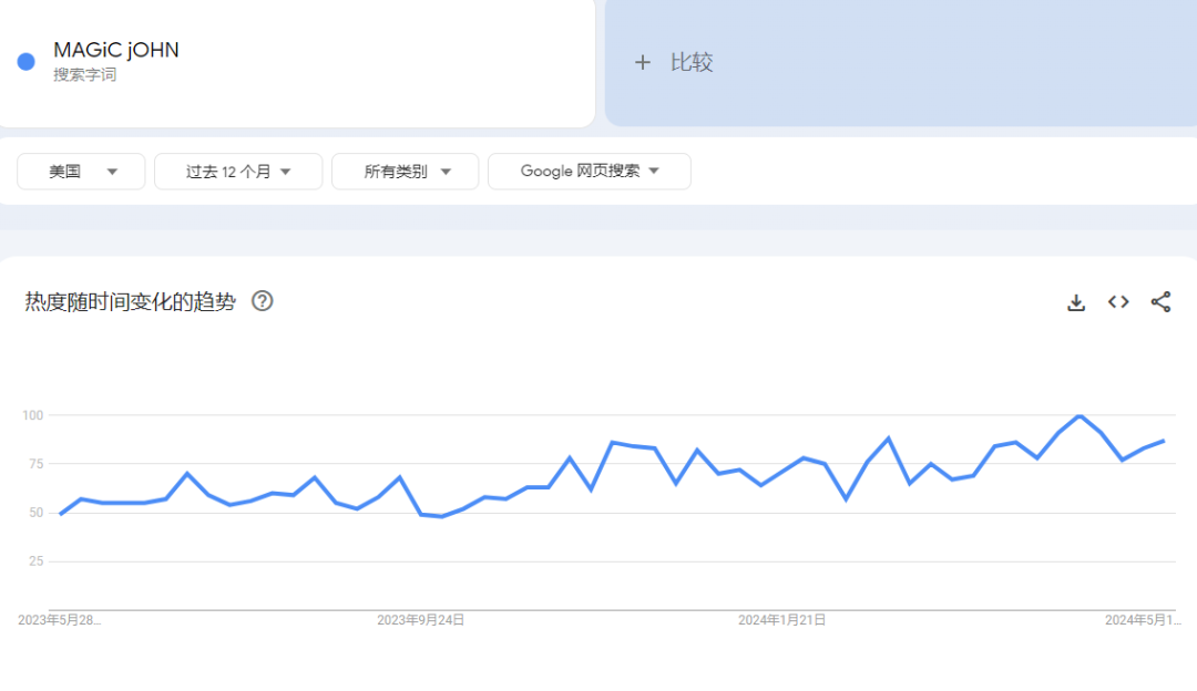 通过Google Trends我们可以了解到一定时期内,产品关键词在搜索引擎上的搜索热度和市场趋势。输入关键词“MAGiC jOHN”可以看到,美国地区在过去30天里对于这一品牌手机膜的搜索程度是非常高且稳定的,甚至在4.28-5.4这一周的时间里达到了热度的顶峰。